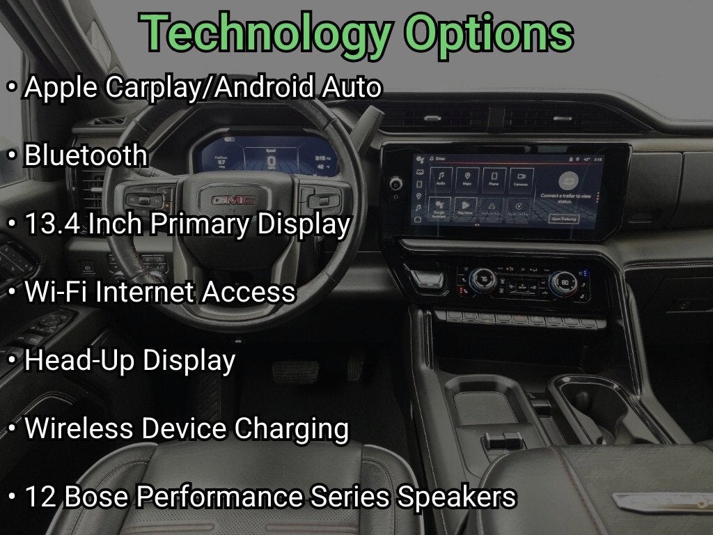4WD, Leather, Heated Front Seats, Rear Heated Seats, Memory Seat, Power Driver Seat, Power Passenger Seat, 360-degree surround-view camera systems, Back-Up Camera, Blind Spot Monitor, Forward Collision Warning, Lane Departure Warning, Parking Assist Sensors, Rear cross traffic warning, Adaptive Cruise Control, Automatic emergency braking, Brake Assist, Bluetooth® Connection, CarPlay/Android Auto, Navigation, Premium Sound System, Steering Wheel Audio Controls, XM Satellite Radio, Smart Device Integration, WiFi Hotspot, Wireless CarPlay/Android Auto, Wireless Phone Charging, Keyless Entry, Remote start, Auto High Beam Headlights, Heated Mirrors, Auto-dimming mirrors, Bedliner, Sunroof, Tow Hitch, Power Retractable Assist Steps, 10-Speed Automatic, 4WD, Obsidian Rush Leather, Deep-Tinted Glass, Emergency communication system: OnStar and GMC connected services capable, Following Distance Indicator, Front Bucket Seats, Front Pedestrian Braking, Front Rain-Sensing Wipers, GMC Connected Access Capable, Heated steering wheel, Integrated Trailer Brake Controller, Off-Road Suspension, OnStar & GMC Connected Services Capable, Power Sliding Rear Window w/Defogger, Power Sunroof, Preferred Equipment Group 4SG, Safety Alert Seat, Snow Plow Prep/Camper Package, Wheels: 18 Machined Alum w/High Gloss Blk Accents.