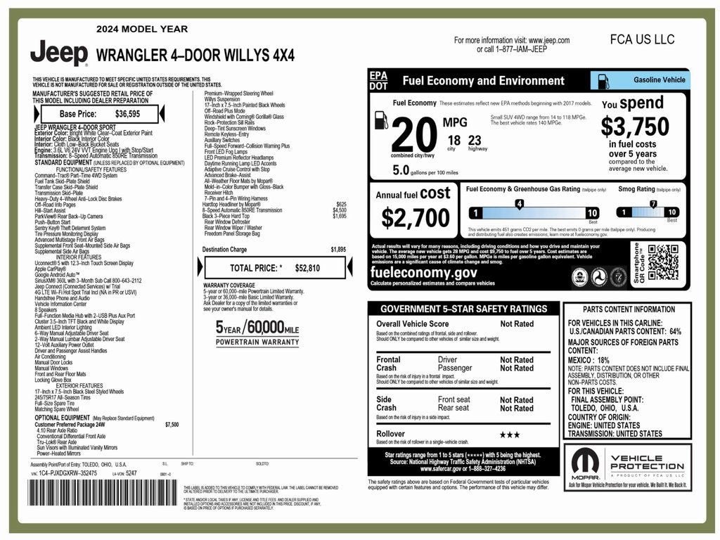 2024 Jeep Wrangler Willys 4WD 8-Speed Automatic 3.6L V6 24V VVT Bright White Clearcoat